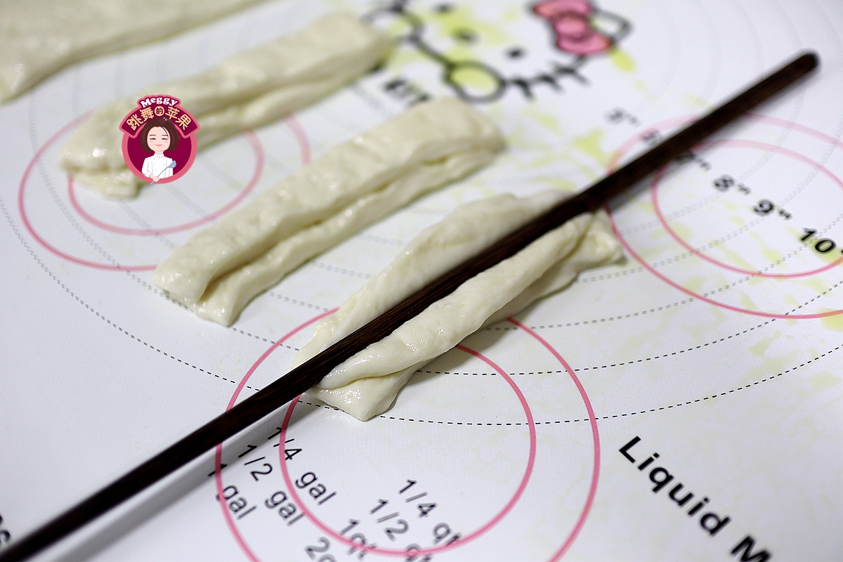 9. 两个小面剂摞一起,用筷子纵向压一下,稍用力,但不要把面剂子压透,经过筷子的按压后,油条在锅里膨胀得更好;