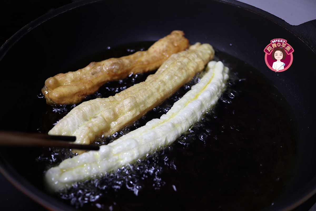 4. 油温不要高,小火加热,不停翻动油条,使其受热均匀,炸到颜色比理想的略浅些就捞出来,余温还会使油条的表面颜色加深。