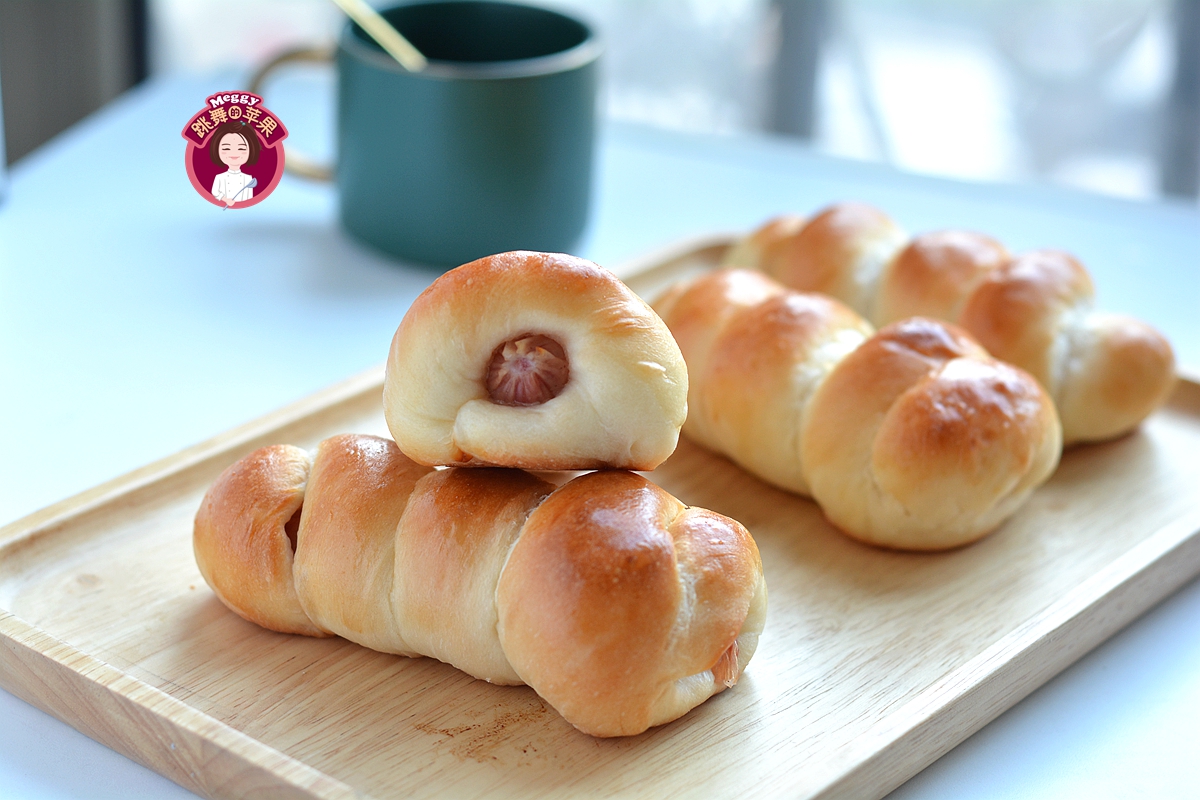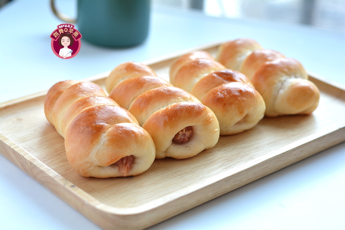 这配方我没有严格按照波兰种和主面团的比例做的,但也一点儿没影响成品的口感。冰箱里有一袋台式香肠,还是年前囤的呢,真空包装不怕放,除了中间给孩子做披萨饼用了一袋外,还剩下一袋,所发只能卷5个面包。剩下的面团也没难倒我,为了与其它5个面包卷能同时成熟,我把这个做成了面包结。没有香肠的衬托,这面包也依然好吃。