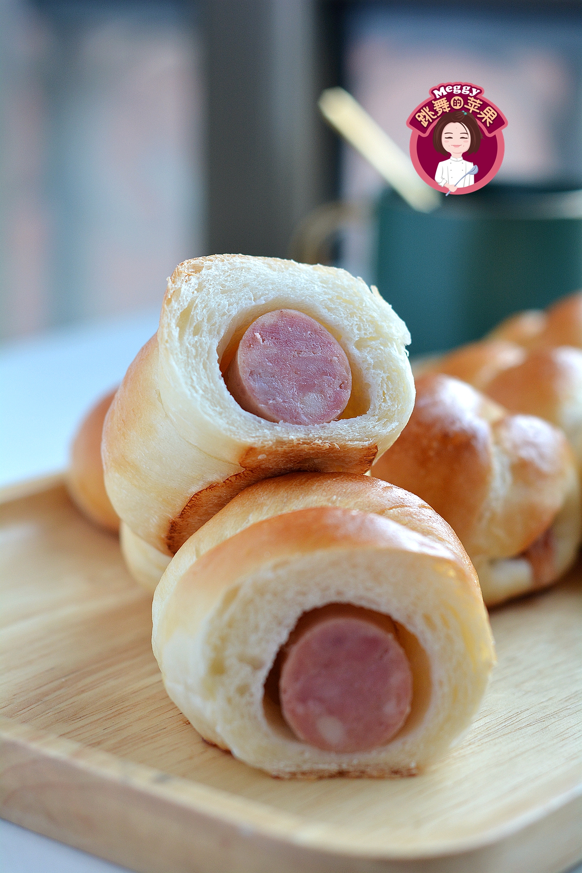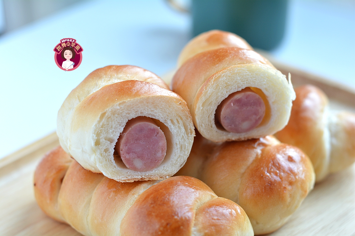 【主面团材料】高筋面粉150克,凉水90克,白糖10克,盐2克,干酵母2克,黄油15克,香肠5根,表面刷蛋液适量