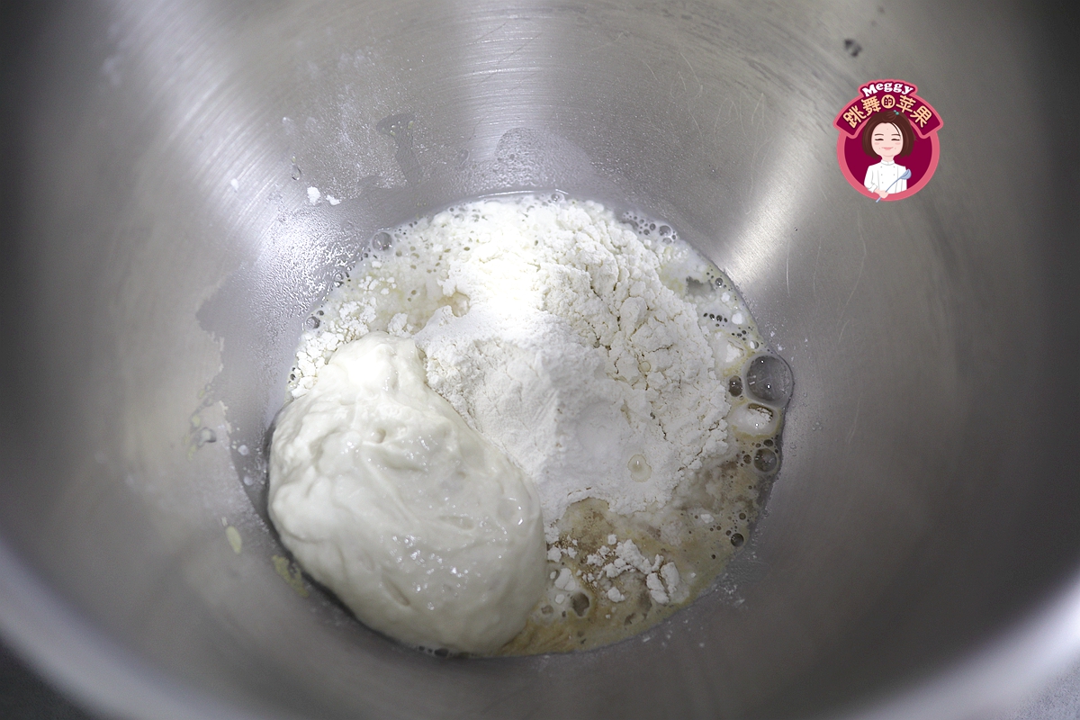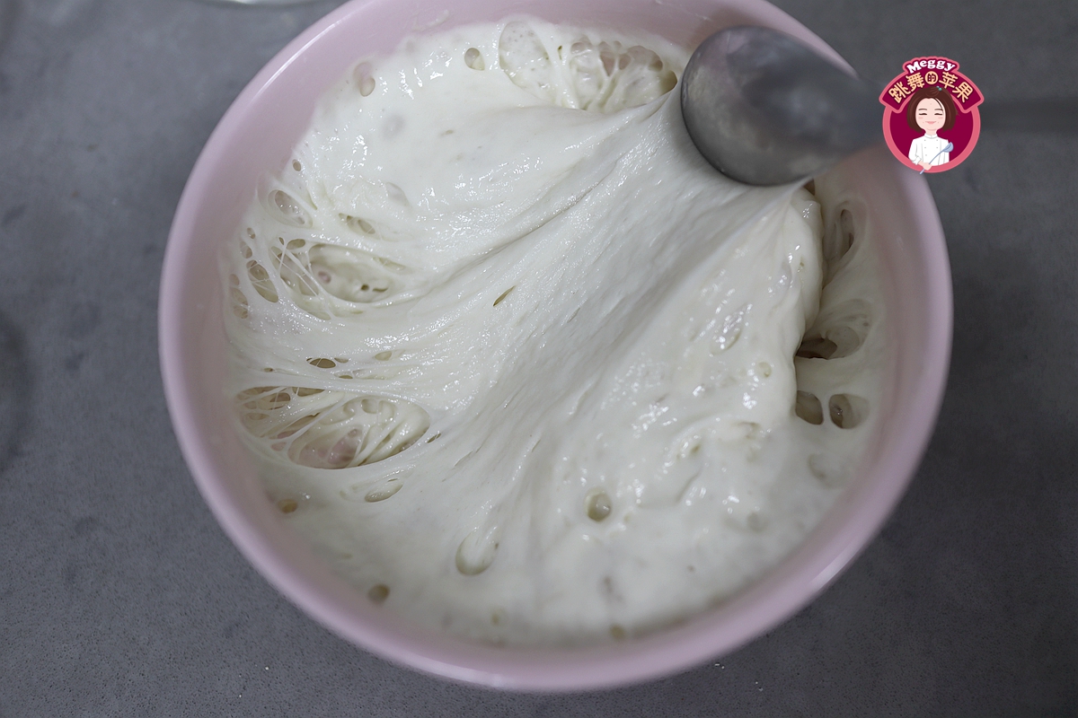 1. 此方用的波兰种,不着急用可提前一晚搅拌好面糊,放冰箱冷藏发酵;面粉与水的比例为1:1,酵母为0.5-1%(时间越长,酵母越少)。酵头面粉量一般为主面团面粉量的25%,但也并不限于此比例;酵种表面及内部有大大小小的气泡和拉丝即可使用;