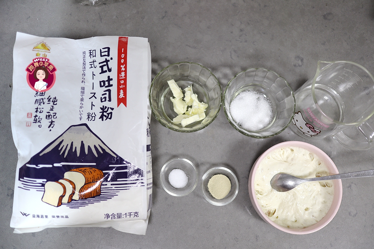 3. 面包主材准备好:吐司粉(高筋面粉)150克,波兰种发面团,白糖10克,盐2克,耐高糖干酵母2克,黄油15克,凉水90克;