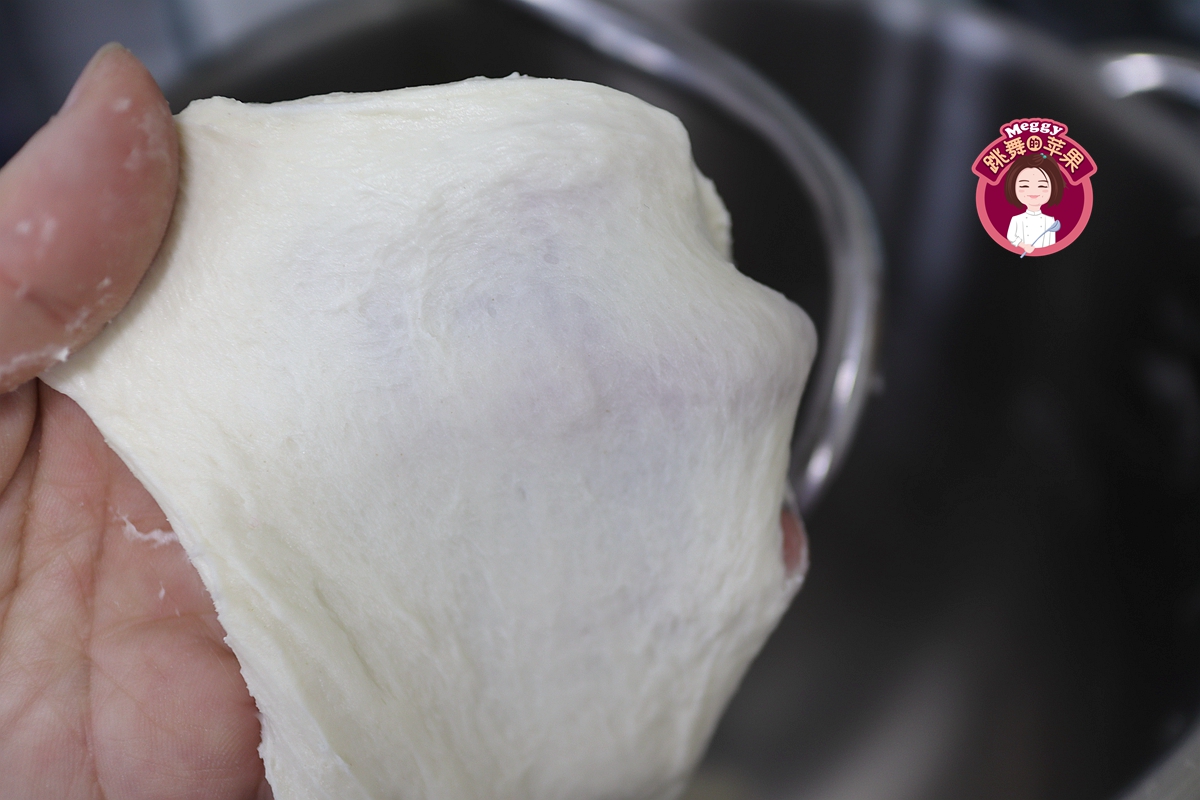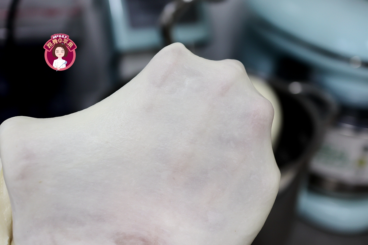 6. 先用1档慢速将黄油完全揉进面团中,再转3档中速将面团打滋润,柔软而不粘盆壁,揪一块面团不粘手,能撑出有弹性的透明薄膜;因为要做小面包,不必揉出极薄的手套膜;