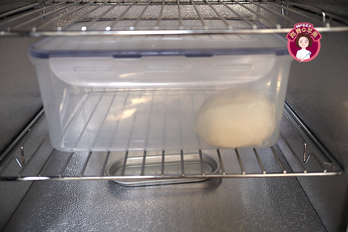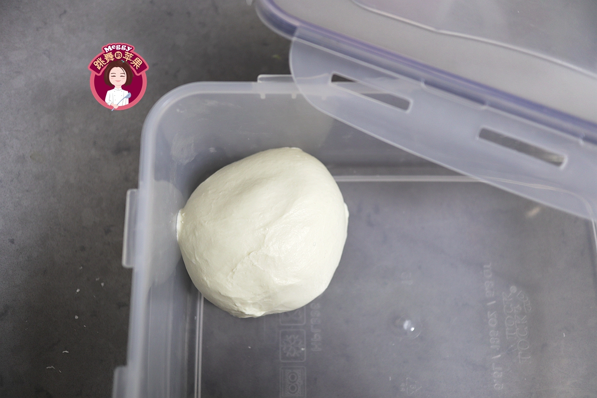7. 面团从揉面桶中取出,放在保鲜盒中,在温暖湿润处基础发酵;