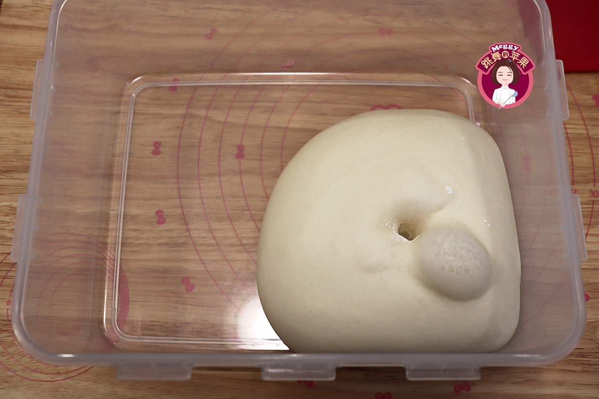 9. 面团是原来的2倍大时,手指蘸面粉在面团顶部戳个洞,不塌陷不回缩,发酵成功;