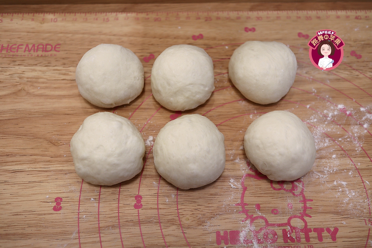 10. 案板上撒少许面粉,面团倒在案板上,轻轻拍打排气,称重分成6等份,分别揉圆,蒙保鲜膜静置10分钟左右;