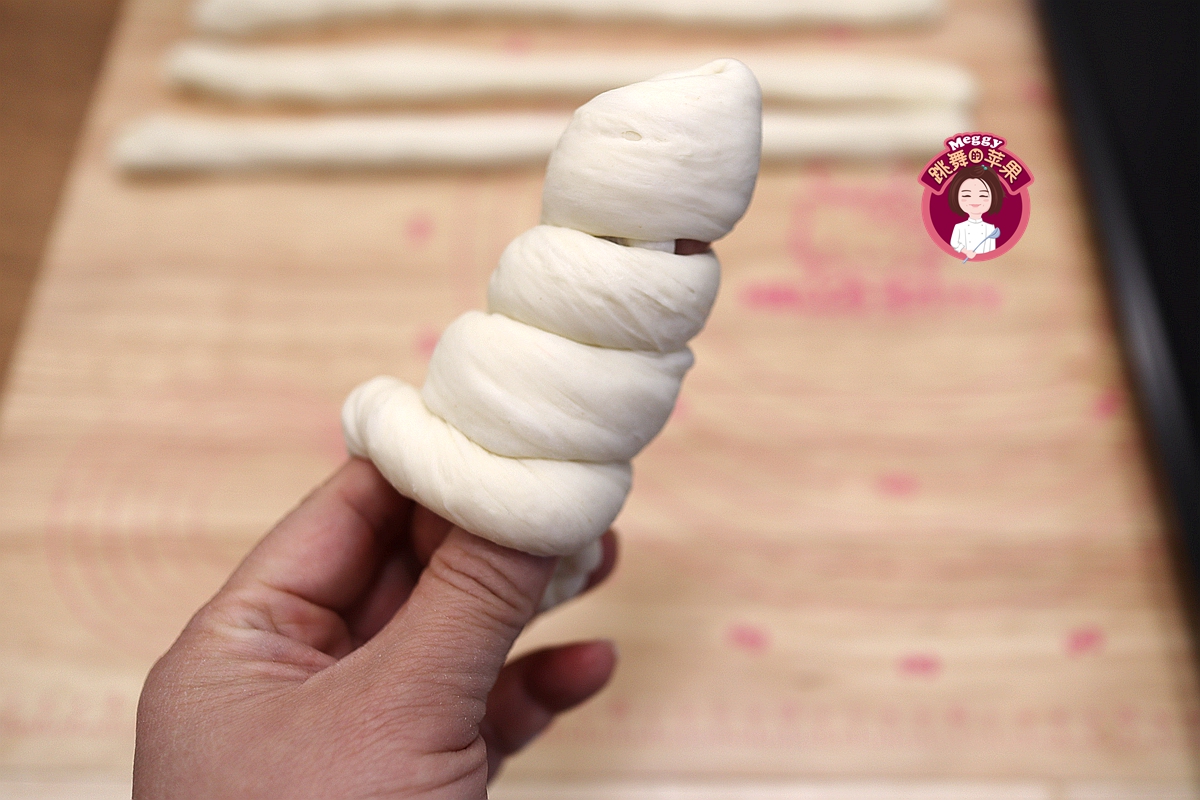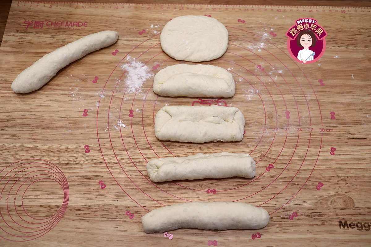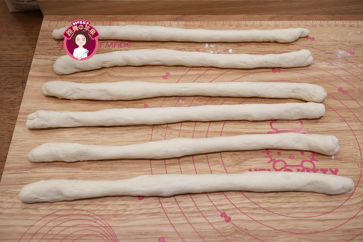12. 6个面团依次做成圆住,再分别滚长至35公分左右;