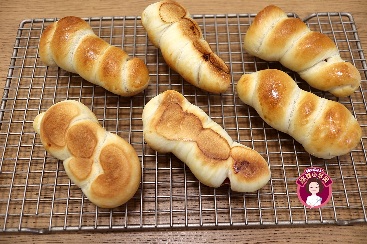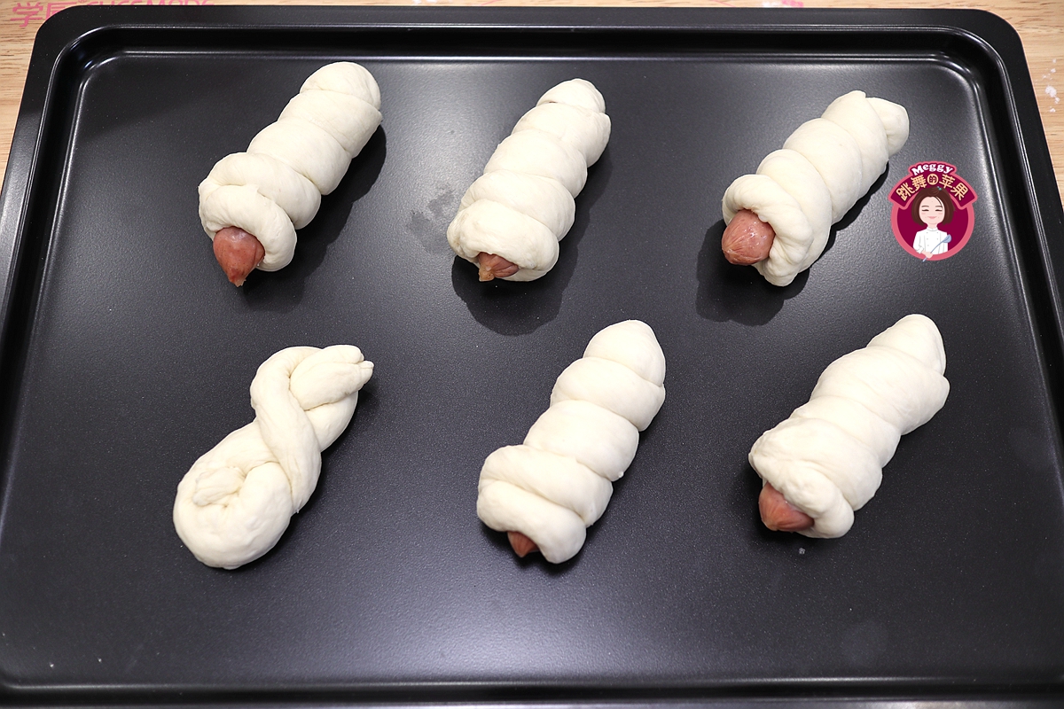 14. 5根香肠做成了5个香肠卷,剩下的1根没有香肠了就做成了一个面包结;放在不粘烤盘里,温暖湿润处二次发酵;