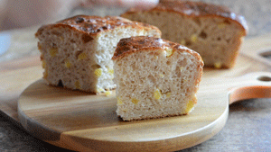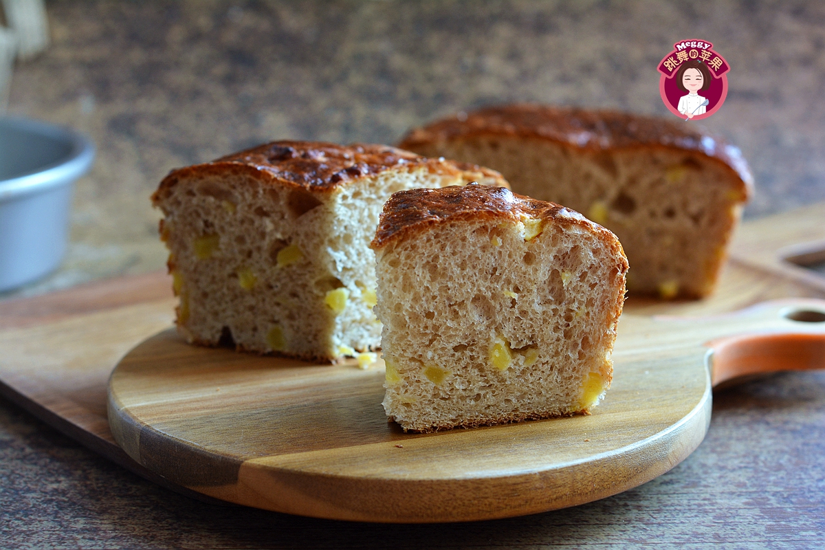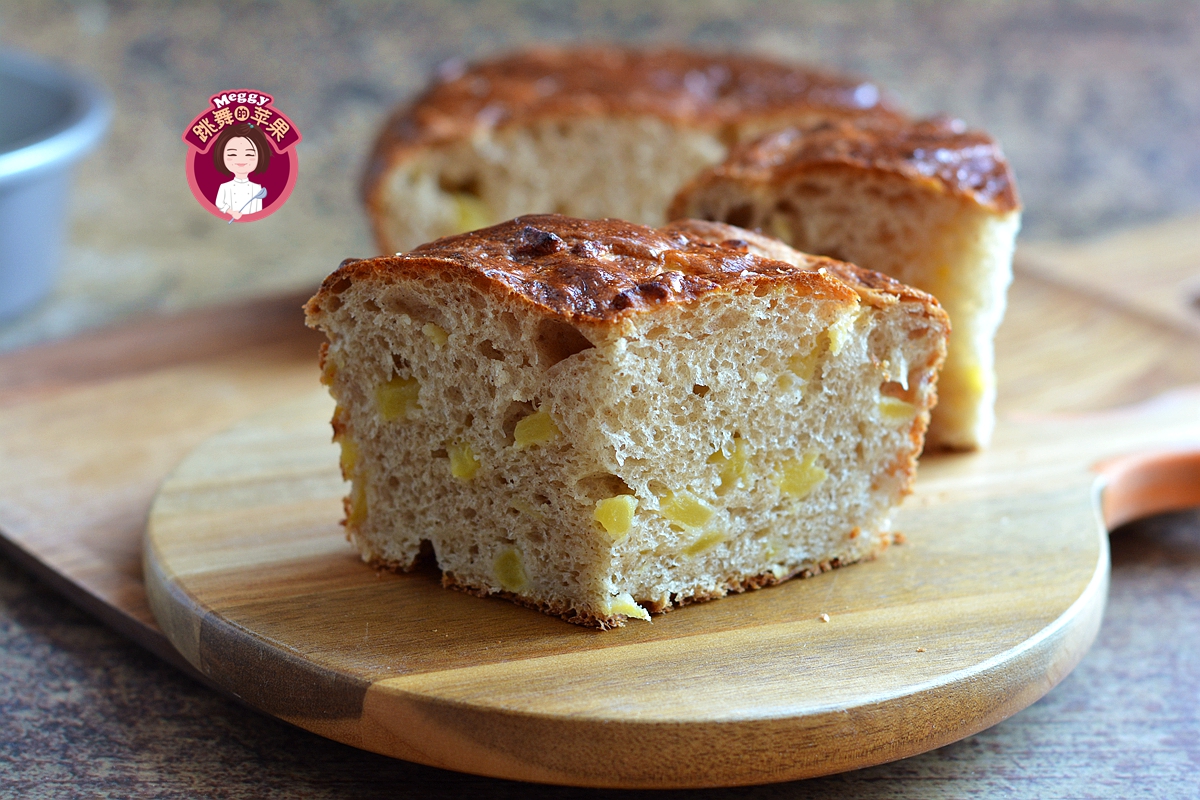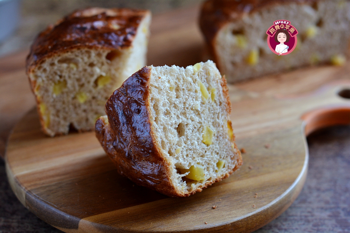 这面包猛一看黑不溜秋的,但是这也正是它的特色。因为放了新鲜的苹果和肉桂粉,苹果丁中渗透出来的果糖会加深面包的上色。而切开之后,嫩黄的苹果丁,暄软的组织,“销魂”的苹果肉桂味,真让人欲罢不能。