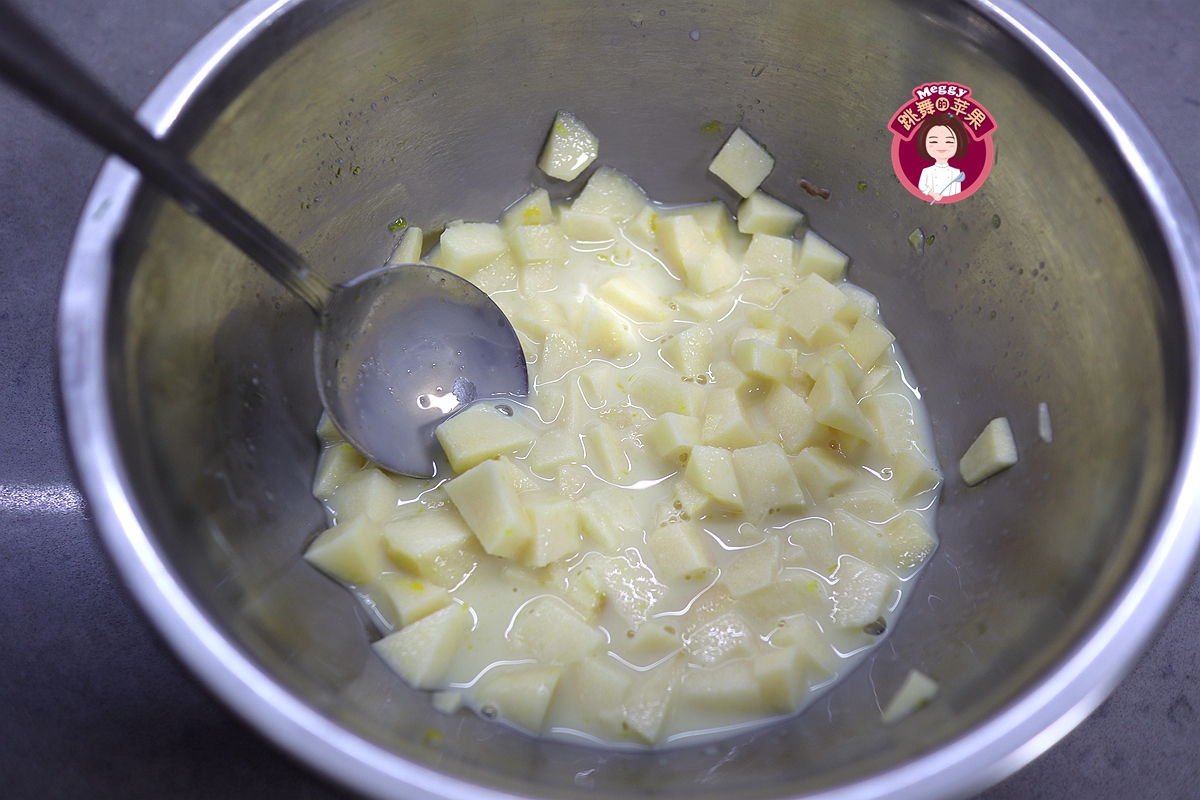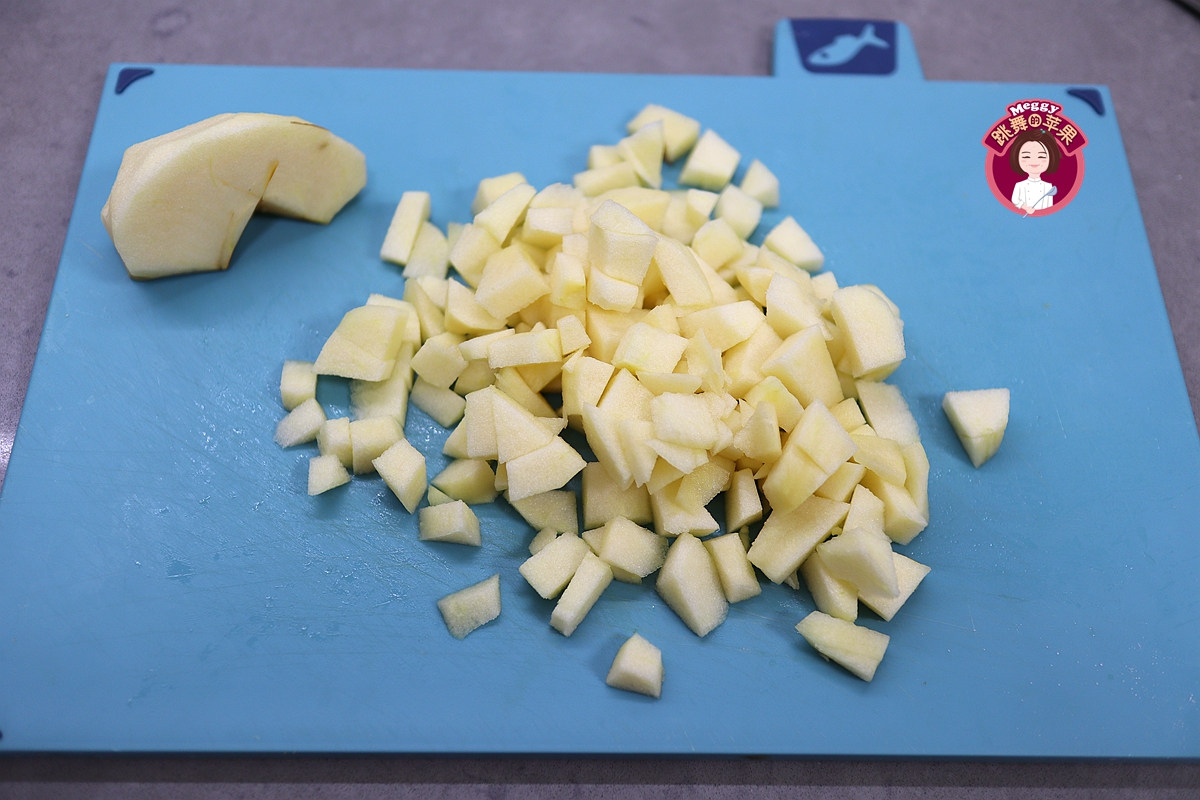 2. 苹果去皮去核,切成1公分左右的小丁,称重120克就可以了;