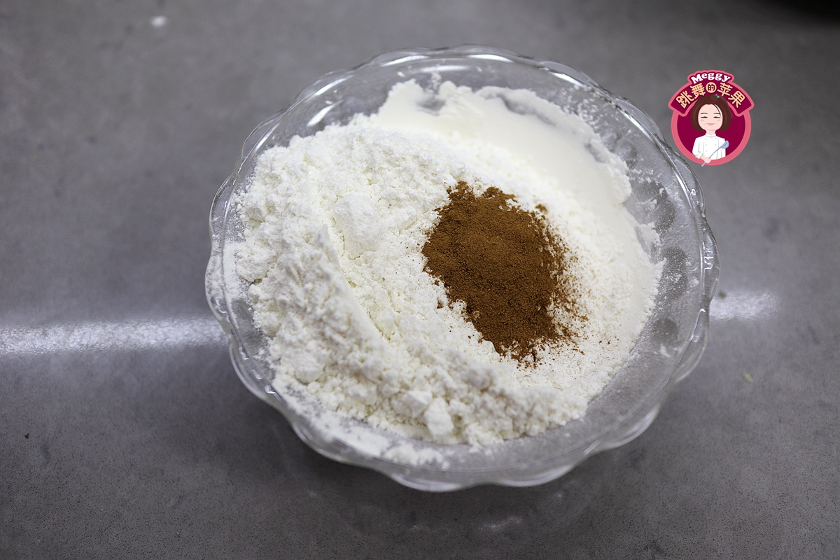 5. 高筋面粉、低筋面粉、肉桂粉同入一碗中,用勺子粗粗混合几下;