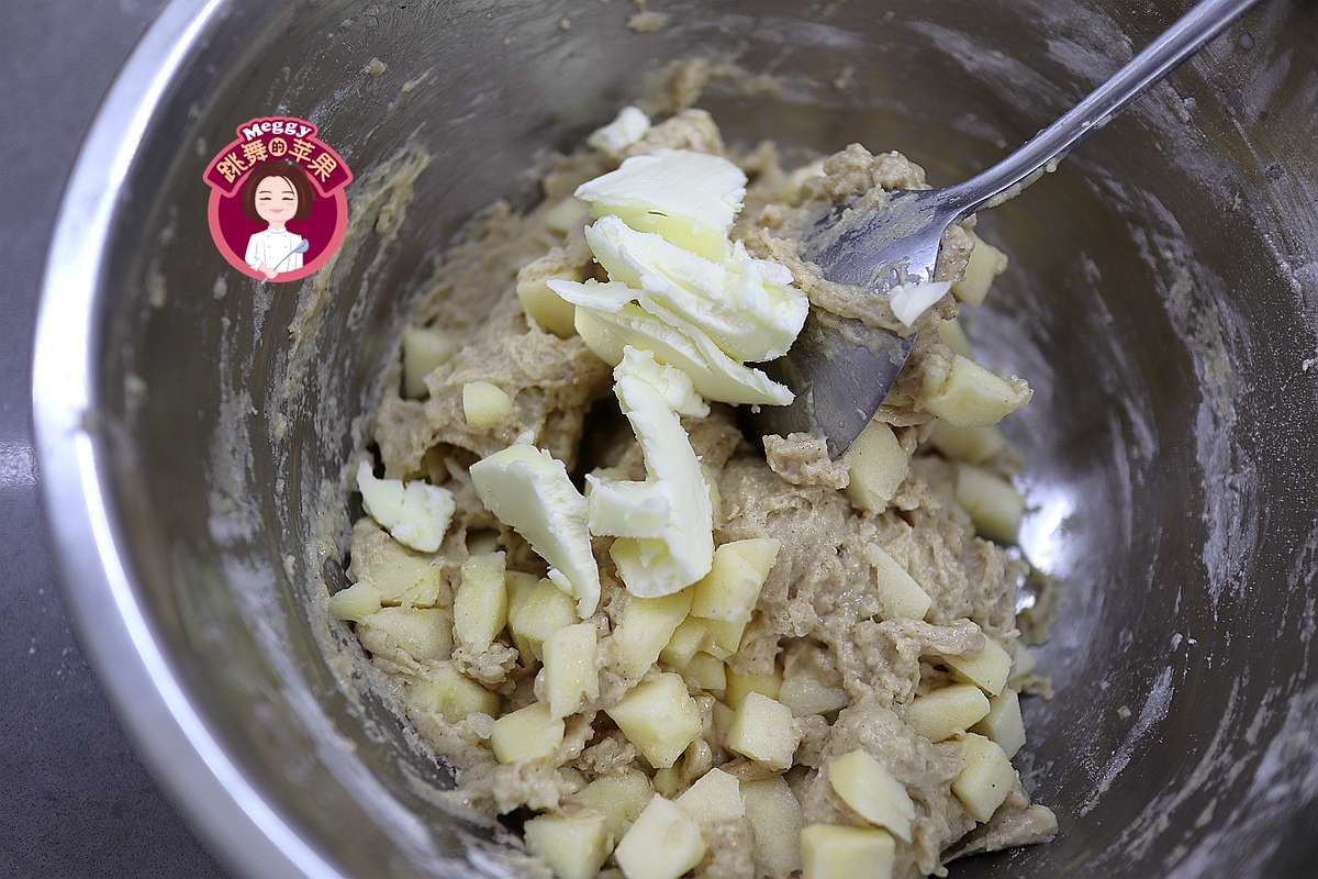 8. 黄油切成薄片并且用勺子碾压,可以快速更均匀地融入面糊中;此时的面糊特别有劲儿,要用勺子顺着一个方向搅拌,苹果丁会从面糊中“跳”出来,不用管,继续搅拌,能看到面糊的纹路就可以了;这个搅拌过程我用了约5分钟;它既像面团,状态又更接近面糊;