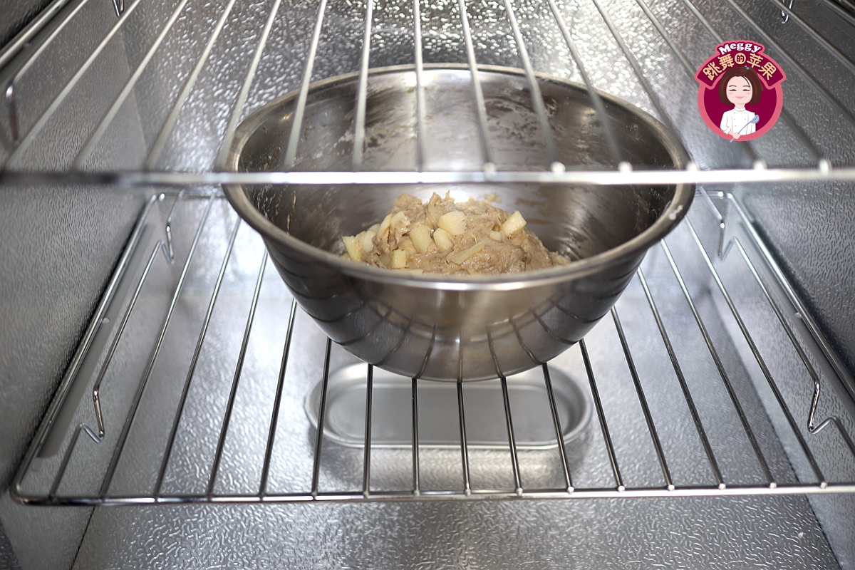 13. 将盛着面团的模具放在温暖湿润处二次发酵,我用发酵箱温度35度,湿度65,时间约50分钟;之所以用这么高的温度,是因为面团中含有大量的苹果丁,需要快速发酵涨发起来,能保持住苹果的新鲜风味,防止缓慢发酵导致苹果变质而失去其风味;
