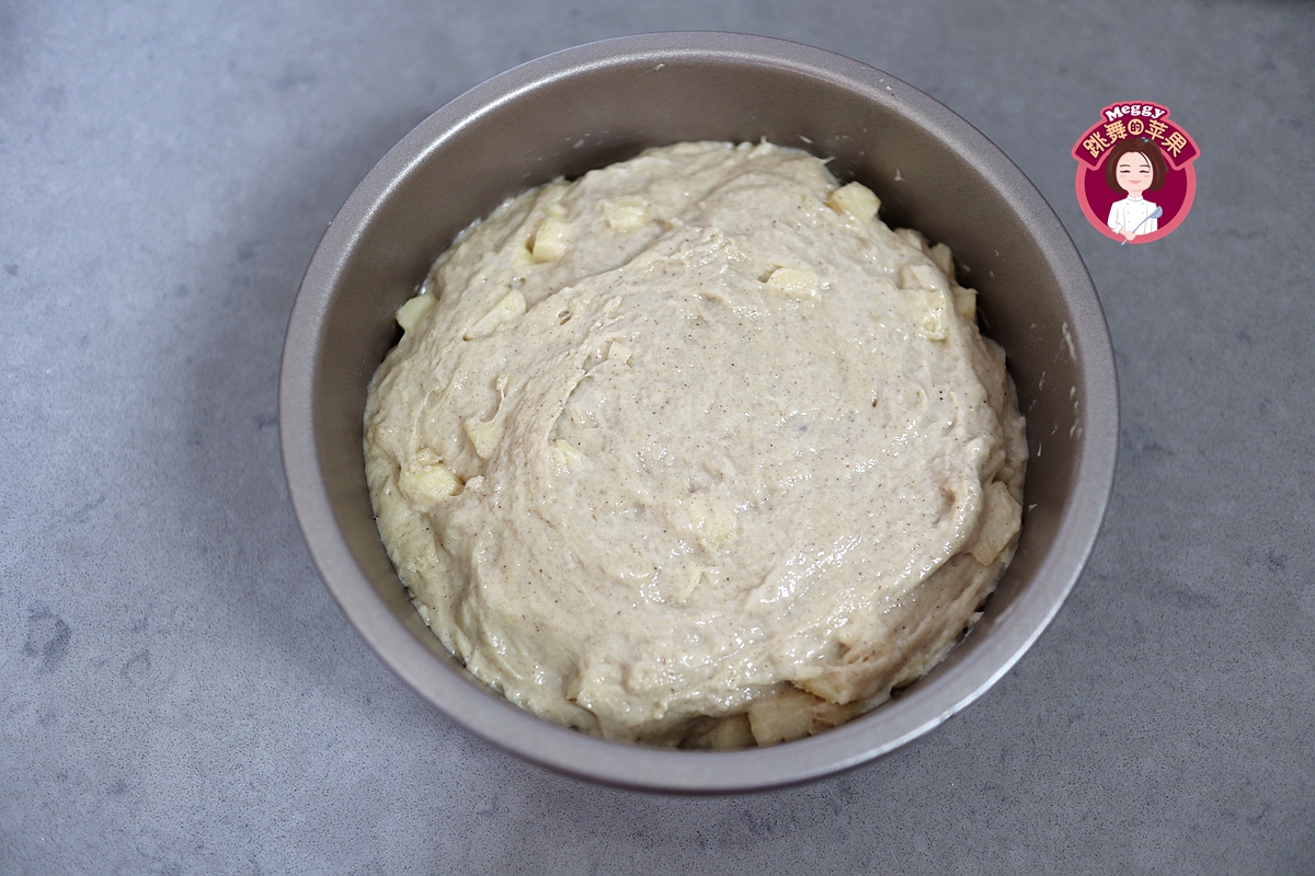 12. 准备一个6寸的蛋糕不粘模具,将面团直接倒入模具中,用勺子轻轻按压,使底部面团和苹果丁能落实;面团较粘,勺子背面可蘸少许凉水,将面团表面抹光滑;