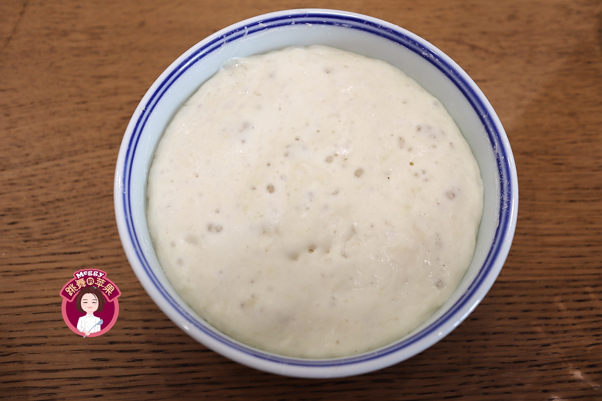 2. 面团是原来的2-2.5倍大小,表面有大大小小的气泡,有让人愉快的发酵后的味道;用勺子挑起面团表面,面团下面是细长的拉丝,有大大小小的气孔;波兰种可以当天制作,也可以头天晚上搅拌好放冰箱冷藏保存,第二天再使用,可节约等待它发酵的时间;