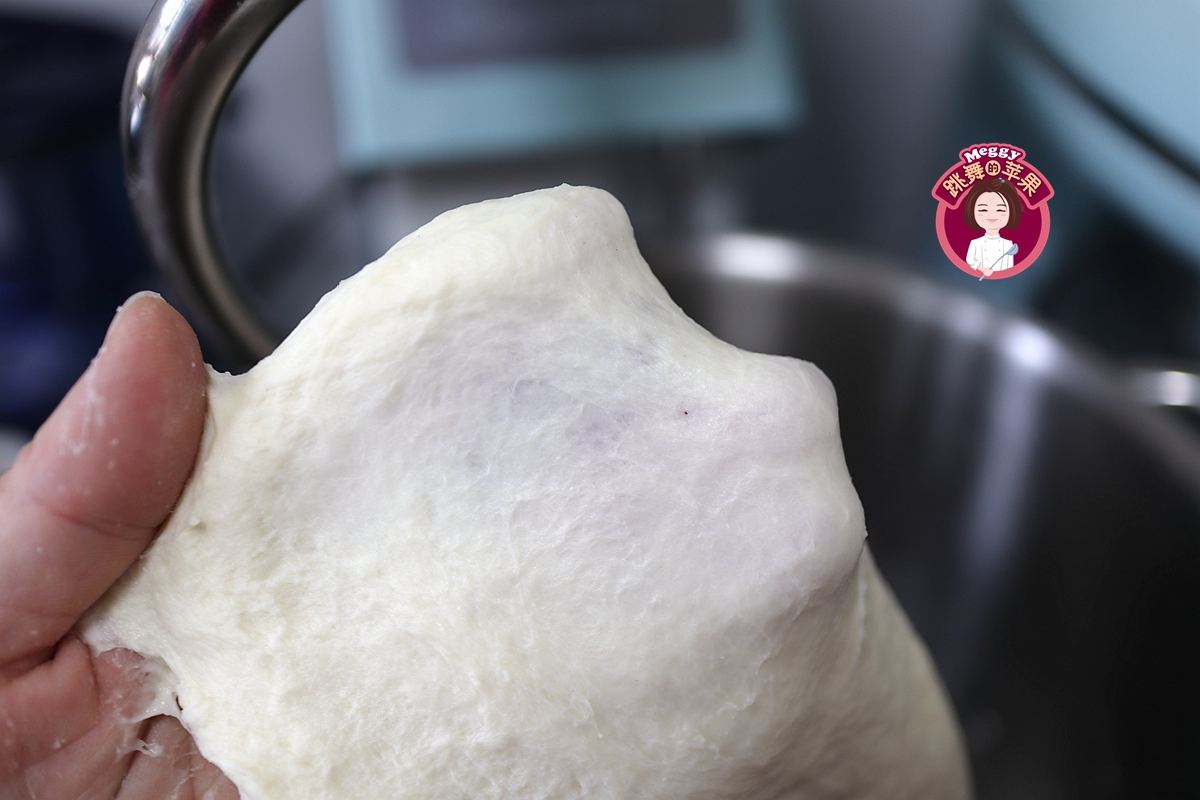 6. 用1档低速将黄油完全揉入面团后转3档中速,搅拌8-10分钟,面团柔软滋润有光泽,不粘盆壁,用手揪一块不粘手,能撑出透明有弹性的薄膜,用手指戳个洞,洞口边缘有小锯齿状或者无锯齿状都可以;