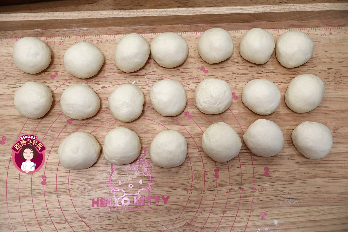 10. 面团倒在揉面板上,如果粘手可撒少许面粉,如果不粘手就不要撒;面团轻轻拍打几下排气,称重分成20等份,再分别揉圆,记住面团摆放的顺序;