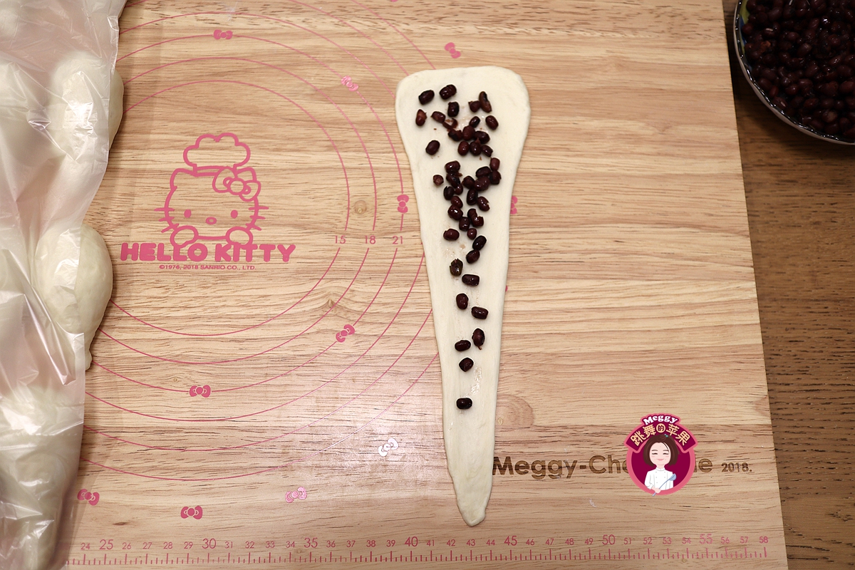 12. 按水滴面团搓的时间顺序,取一个面团,光滑面朝上,左手轻轻揪着面团细小的部位,右手用擀面杖从上向下稍微擀几下,形成一个倒三角形;然后翻面,使刚才光滑的表面朝向案板,这面将会成为面包卷的表面,所以要选用光滑漂亮的面皮;面皮翻面后会有变形,需要重新擀成倒三角形,将红豆零星铺撒一些,尖端尾部留出空白不要撒;