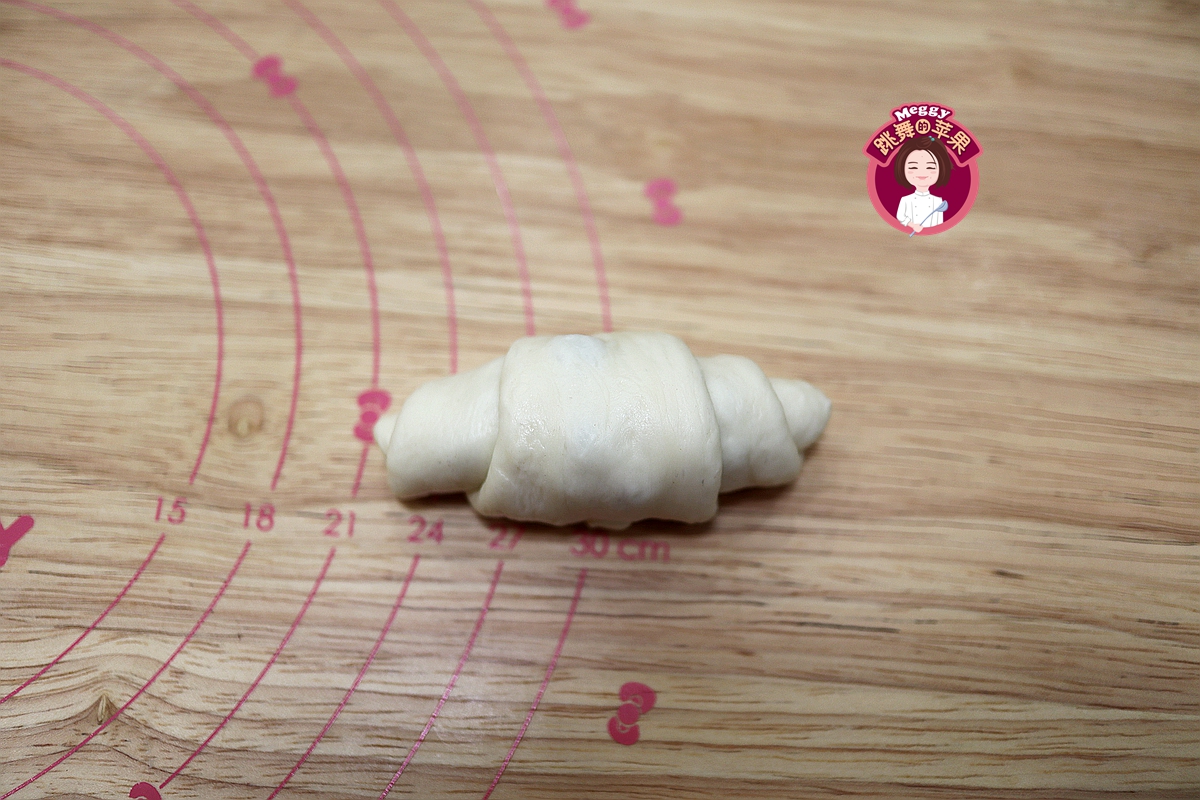 13. 从宽边向尖端卷起,不松不紧,贴着面皮卷过来就成,红豆完全包裹在面皮中,尾端压在下面;