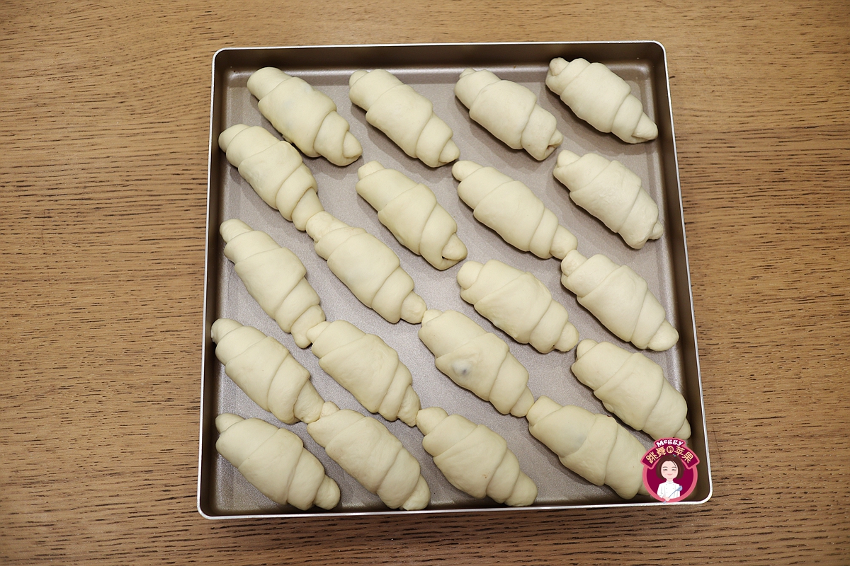 15. 将盛着红豆牛角面包生坯的烤盘放在发酵箱中二次发酵,温度33,湿度65,时间约40分钟,看生坯状态来调整;