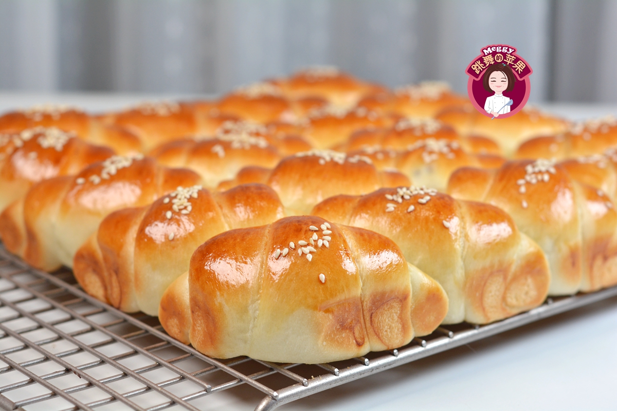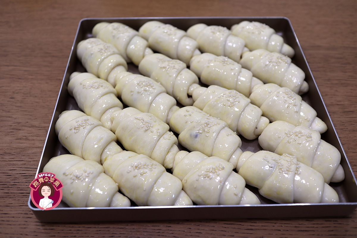 16. 牛角生坯是原来的1.5-2倍大时,表面刷蛋液,撒少许生的白芝麻;烤箱预热200度;