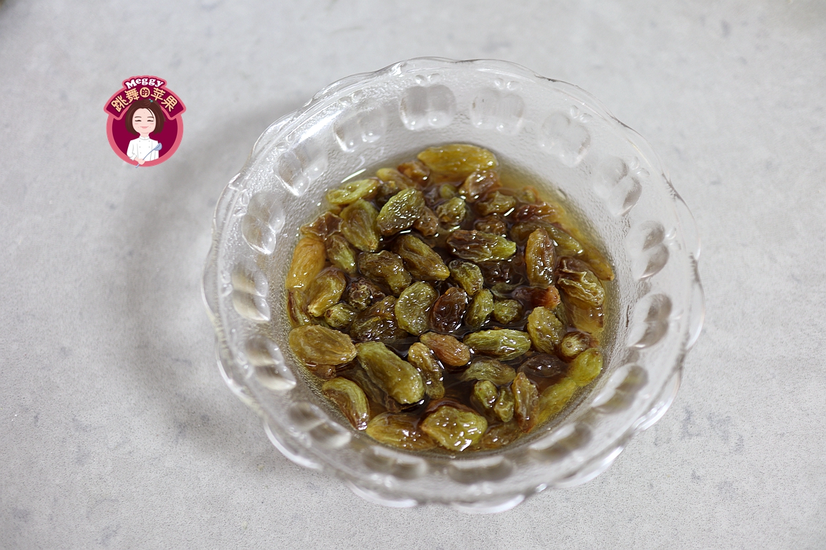 3. 葡萄干用清水淘洗两遍后沥干水,用朗姆酒浸泡涨发;经过朗姆酒浸泡的葡萄干会给面包带来独特的风味;没有朗姆酒可省去此步,用清水淘洗后沥干备用;