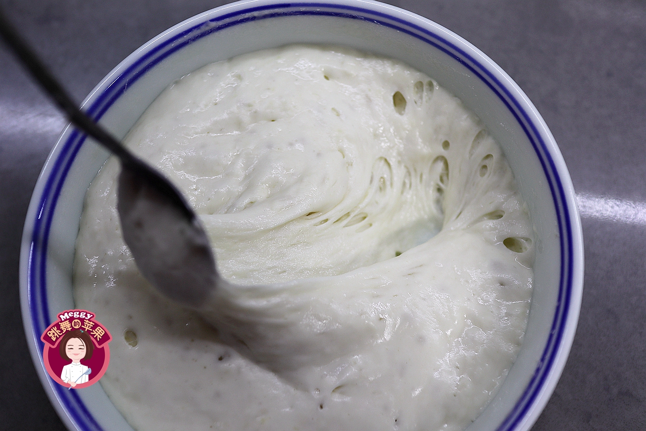 4. 发酵好的波兰种表面会有大大小小的气泡,用勺子将面糊挑起来,有长长的拉丝,面糊底部有均匀的大气孔,还有令人愉快的微微发酵酸味;