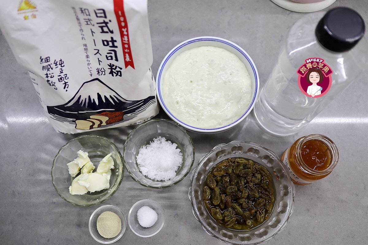 5. 将面包材料准备好:主面团材料高筋面粉210克,耐高糖干酵母2.5克,白糖15克,盐2克,凉水120克,黄油25克,朗姆酒泡发的葡萄干,适量果酱;