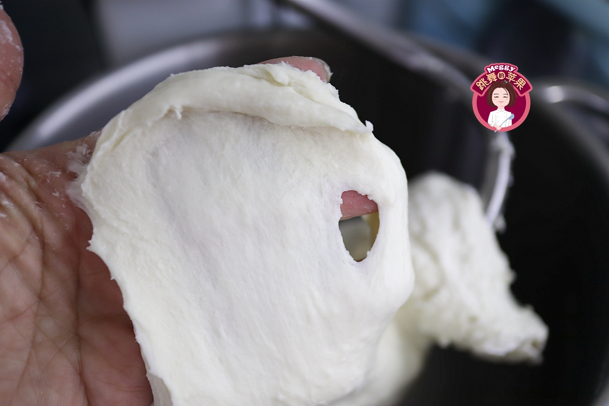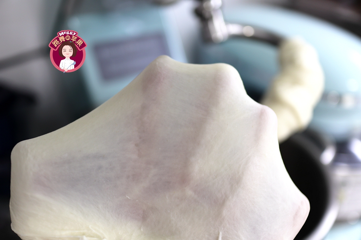 7. 先用1档低速搅拌,让黄油完全融入面团中,再转3档中速搅打面团;面团柔软滋润,不粘盆壁,揪一块面团在手掌上能撑出有弹性的透明薄膜,揉面结束;