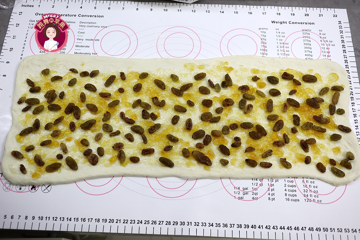 10. 面团倒在揉面垫上,撒少许高筋面粉,将面团擀成厚约4毫米的长方形面片,先均匀地抹一层果酱,果酱不宜太多,烤的时候会溢出来造成浪费,再把吸干表面的朗姆酒泡发的葡萄干撒在上面;