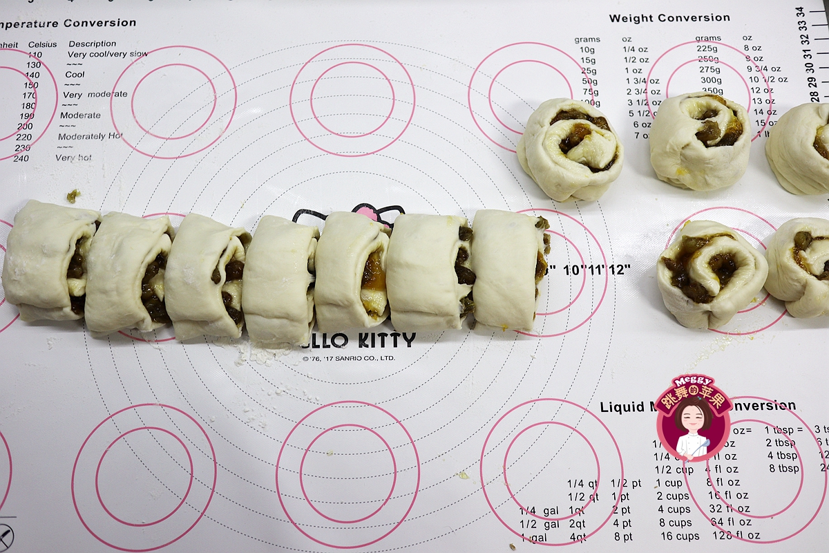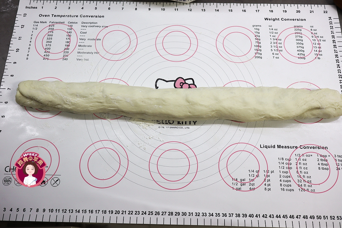 12. 用刮板将面卷平均分成12份,每份重60-65克;也可根据模具的大小来调整剂子的数量和重量;