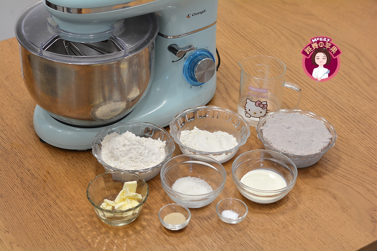 1. 面包主要材料准备好:高筋面粉160克,低筋面粉40克,耐高糖干酵母3克,淡奶油30克,凉水110克,白糖20克,盐2克,黄油18克,夹心用的自制芋泥一碗;