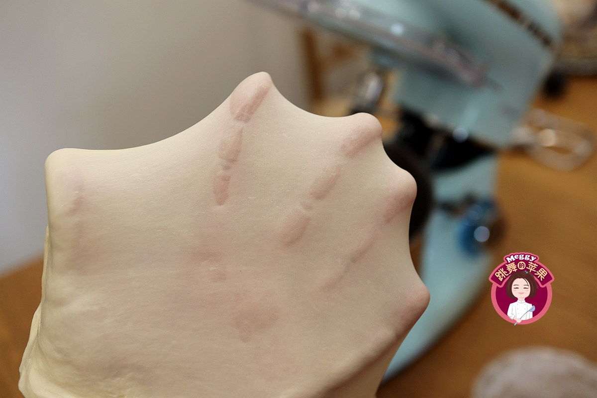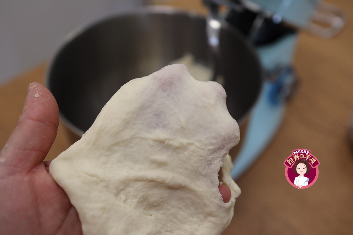 4. 先用1档慢速将黄油全部融入面团中,再转3档中速搅打,面团柔软光滑且不粘盆壁,揪一块面团,面团不粘手,能轻轻撑出透明且有弹性的薄膜,揉面结束;