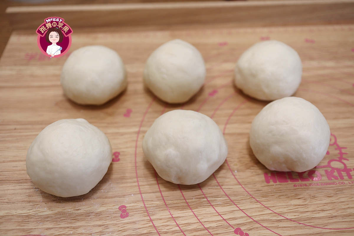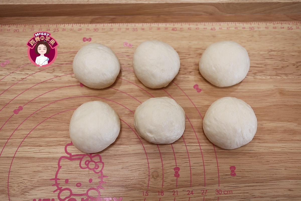 8. 面团倒在案板上,如果不粘手就不要撒面粉,轻轻拍打排气,称重分成6等份,每个面团约63克;分别揉圆,蒙保鲜膜或者扣盆松弛15分钟左右;手指按压面团,面团不回弹就是松弛到位了;