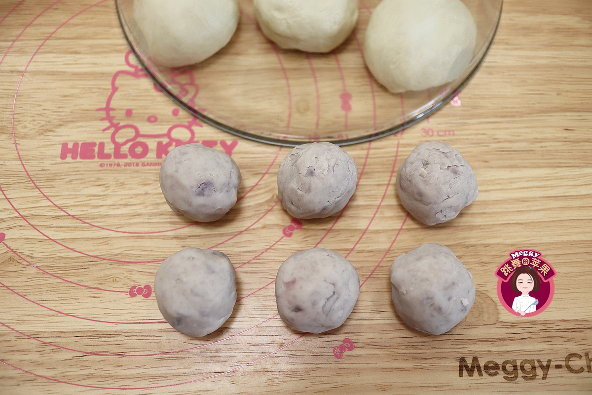9. 松弛面团的时候,将芋泥称重分成每个40克,揉圆备用;