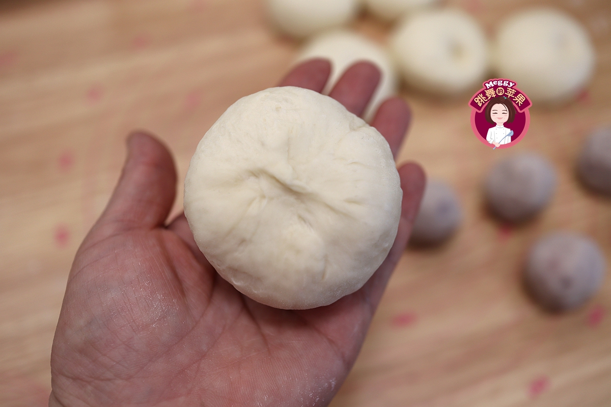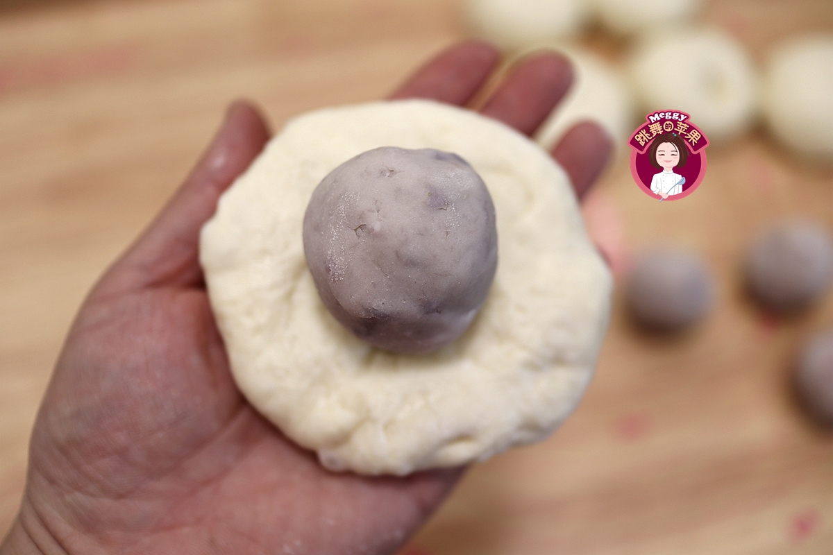 10. 取一个松弛好的面团,轻轻拍扁有手心大小,将芋泥头放在面皮中间;