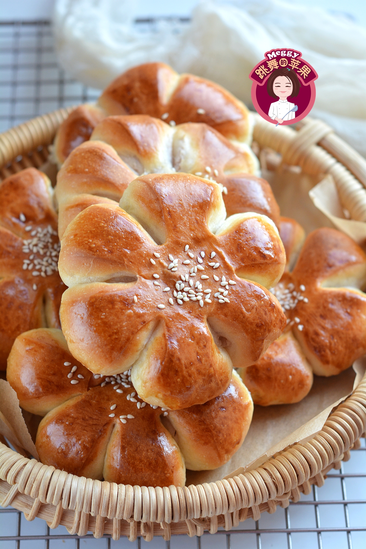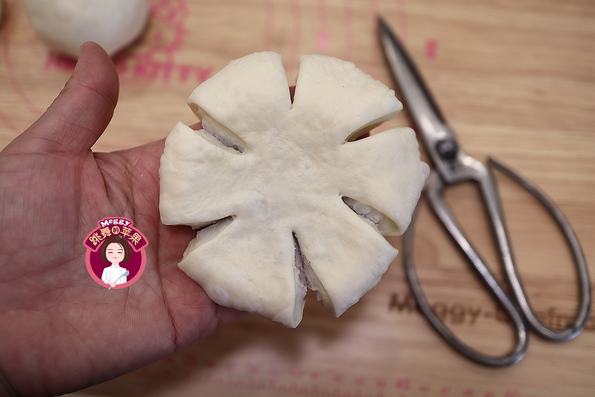 4. 包着芋泥的面团拍得越扁越大,剪出来的花瓣越明显;反之,烤出来的面包近似于小圆面包,且花瓣朴素粘连在一起;