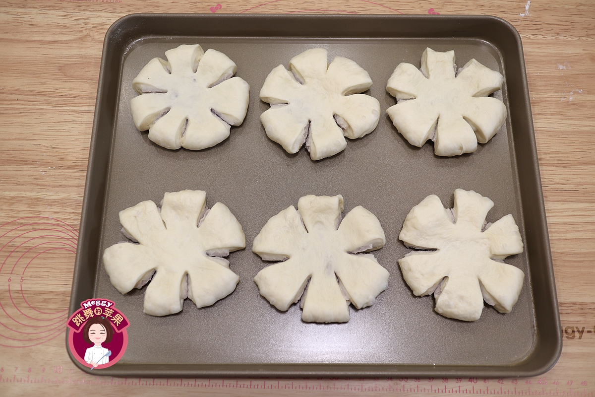 14. 将剪好花边的芋泥面包生坯放在不粘烤盘上,放在发酵箱里二次发酵,温度32,湿度65,约30分钟;也可以放在烤箱里,用发酵档,时间控制在35度,放一晚碗温水增加湿度;