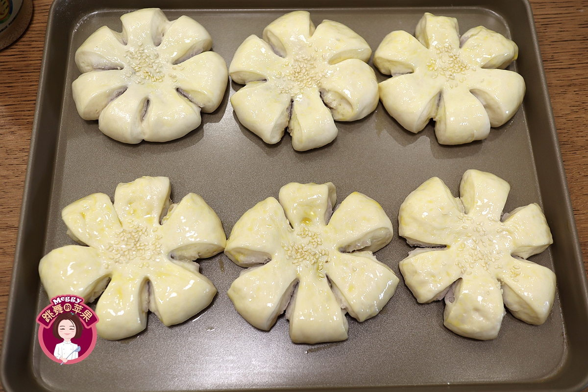 15. 面包生坯是原来的1.5-2倍大,表面刷一层鸡蛋液,中间位置撒少许生的白芝麻;烤箱开始预热200度;