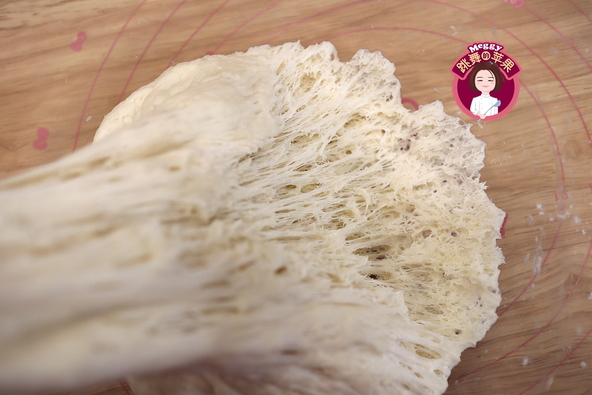 7. 揪起面团,底部能看到细长的拉丝和均匀的气孔,有淡淡的发酵香味;
