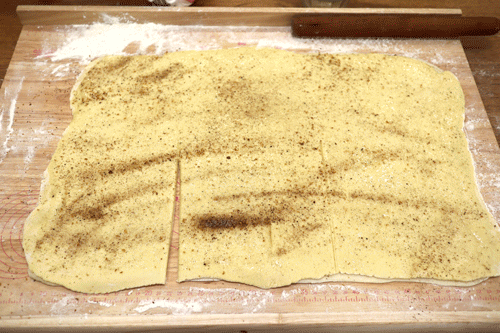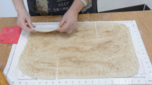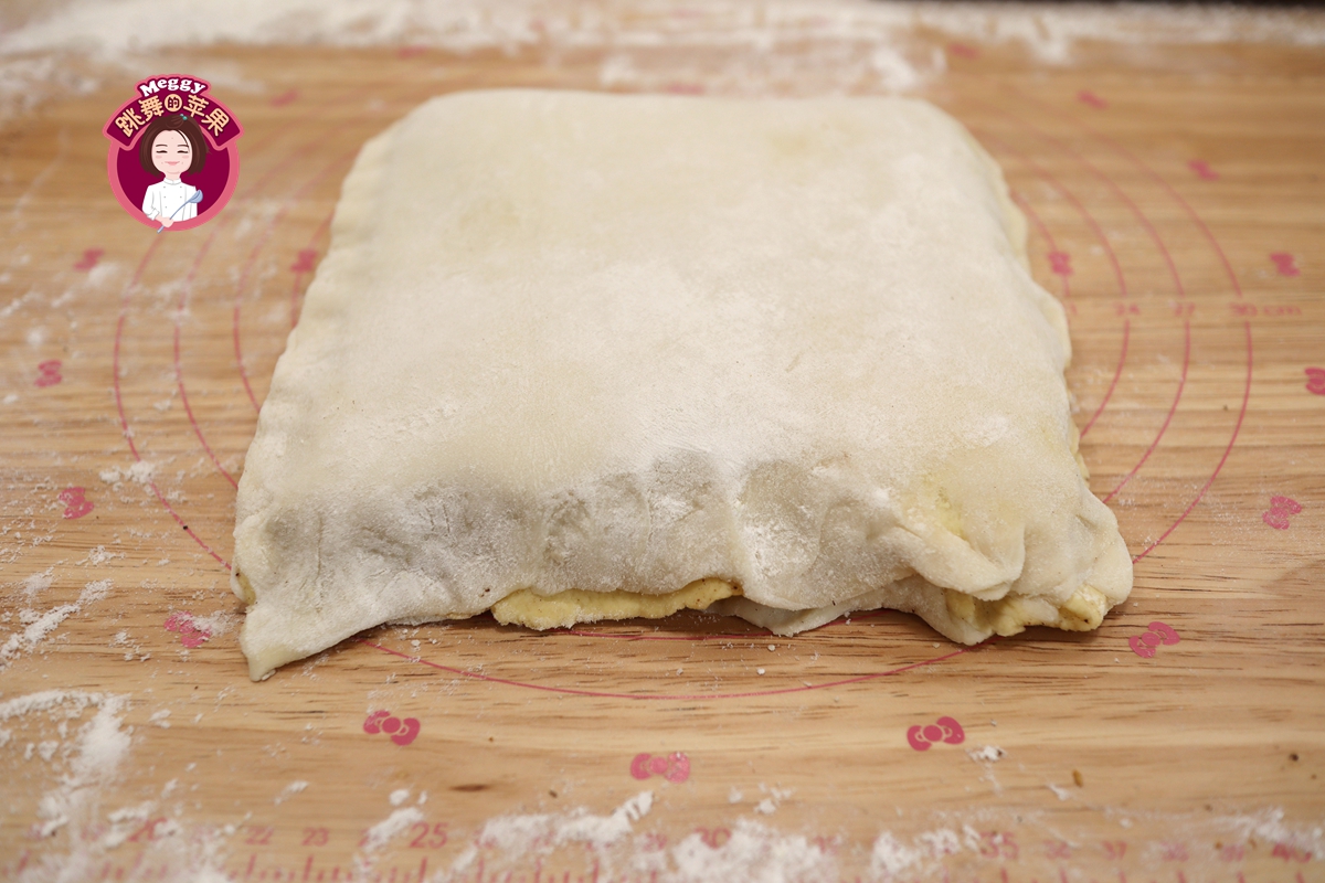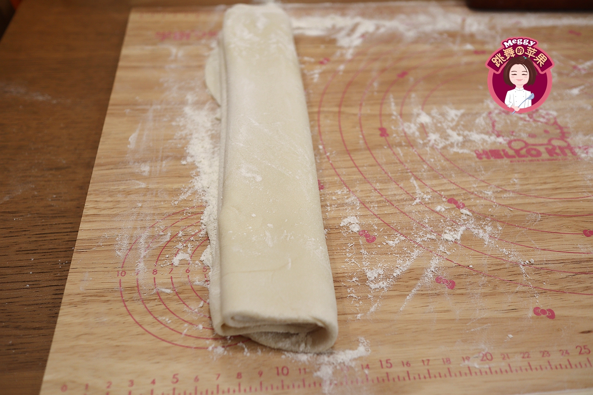 8. 面团放案板上,撒一把面粉,将面团揉光滑,擀成55*40CM的长方形大片,厚度约3毫米;