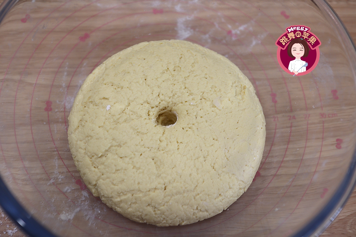 10. 玉米粉面团也发酵好了,手指蘸面粉戳洞,没有弹性;这是因为玉米粉比小麦粉缺少素胶蛋白质和素谷蛋白质,也就是常说的面盘,因此比小麦面团缺少弹性;