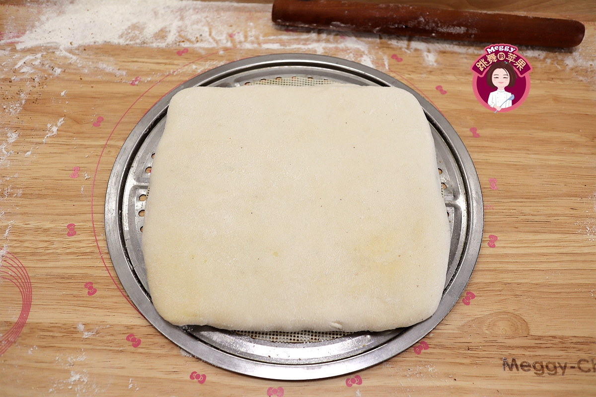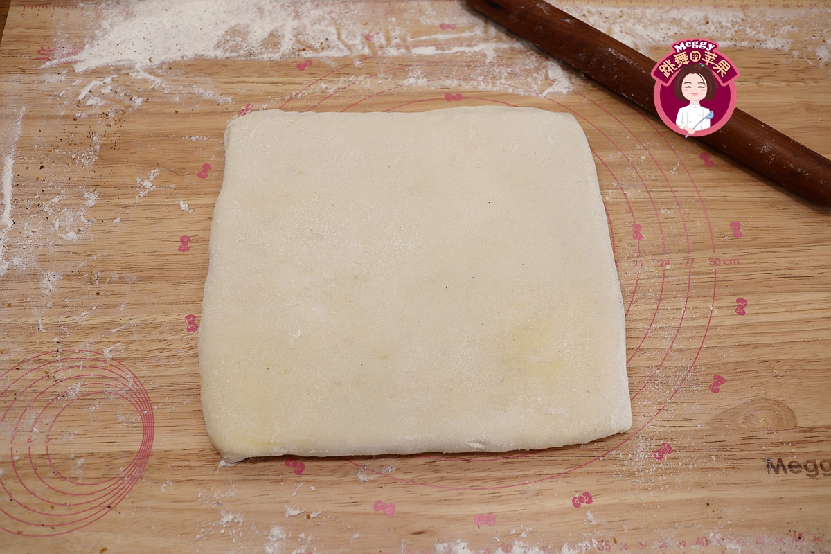 18. 将面饼用手轻轻按扁,再用擀面杖轻轻擀平,方形比圆形更好擀;表面的干粉用刷子刷掉;