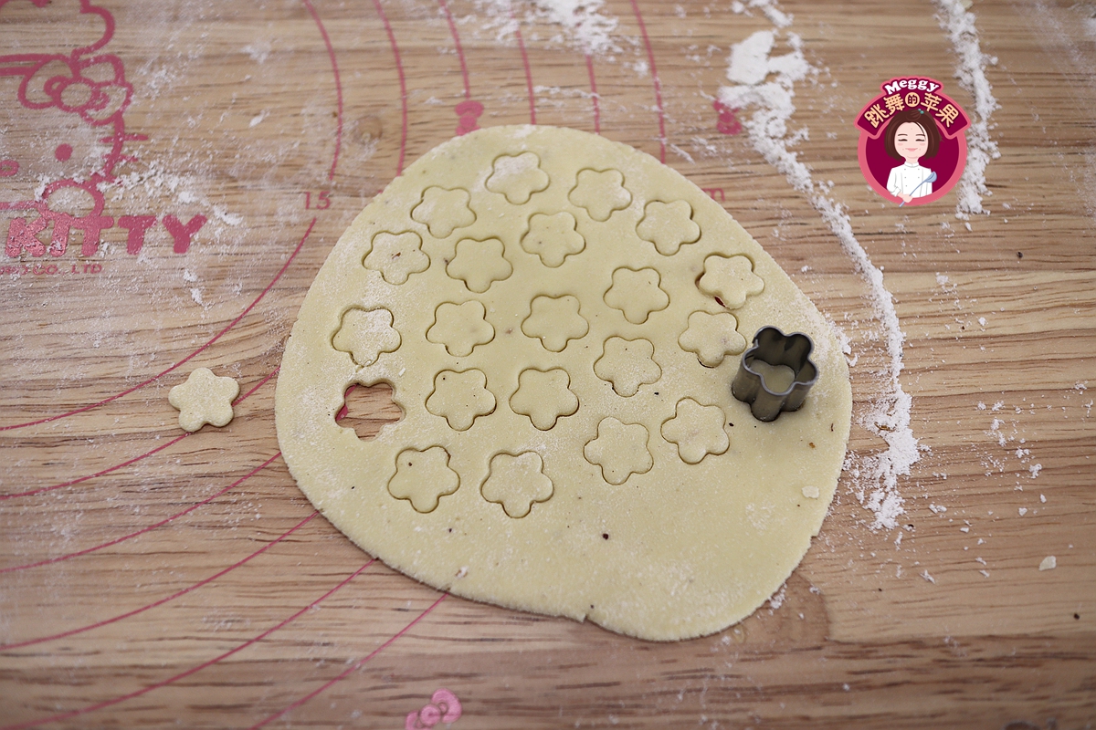 20. 先前留下的小面团擀成薄约2毫米的面片,用花朵小刻模刻出图案;