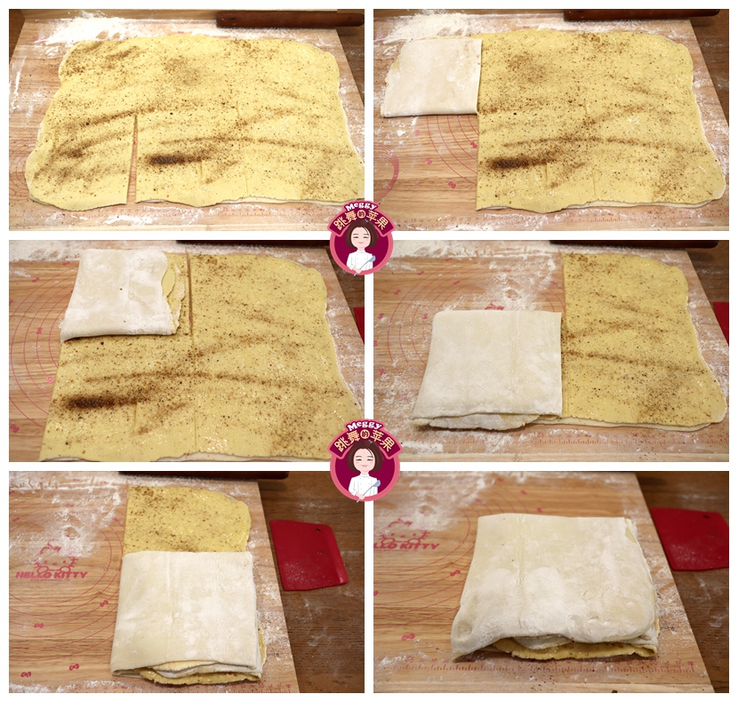 16. 开始折叠面片;如图,假设把面片分成6份,左下角竖切一刀,面片向上折,再向右折;贴着面块的右侧在面片上切一刀,面块继续向下折;再向右折,最后的一皮覆盖在面块上;这是最简单的折法,看图比看文字好理解;如果面皮够大,还可以按“井”字格来折叠,层次会更多;顺便把“井”字格的千层饼方法给大家再展示一下,用哪种方法随你喽;