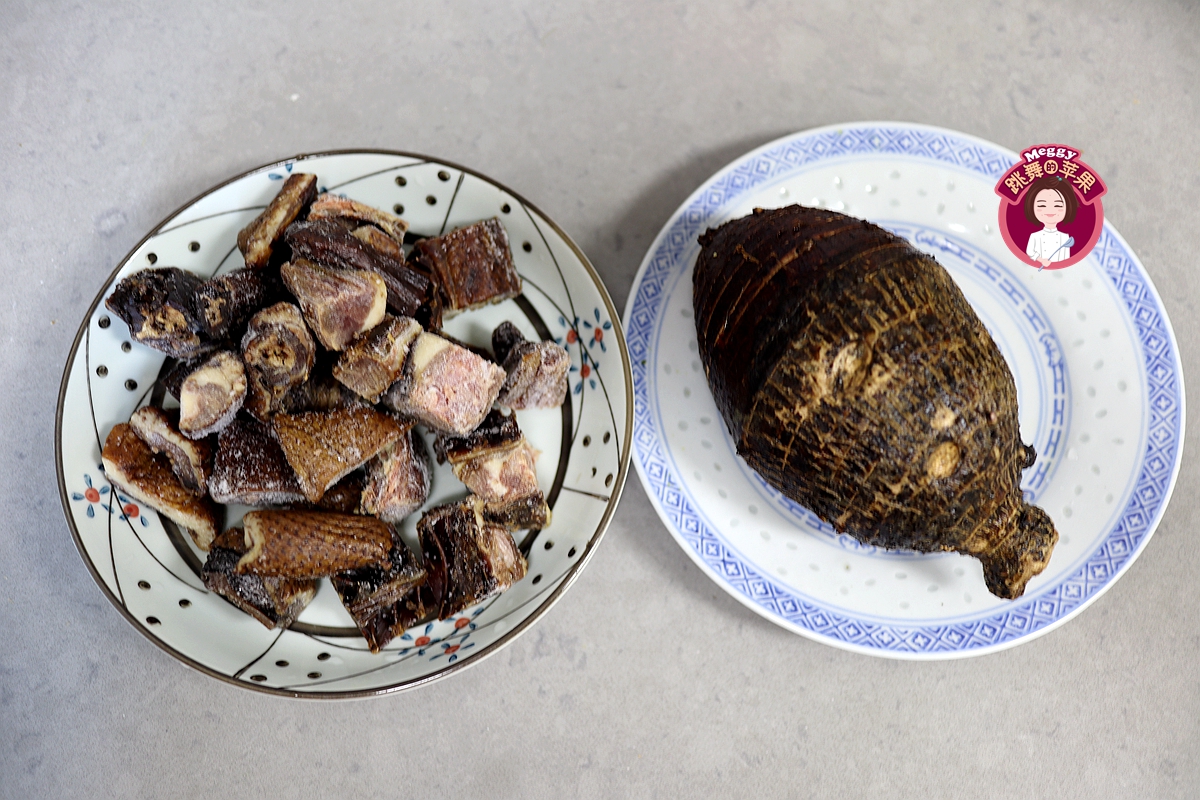 酱鸭剁小块,荔浦芋头外皮冲洗干净;