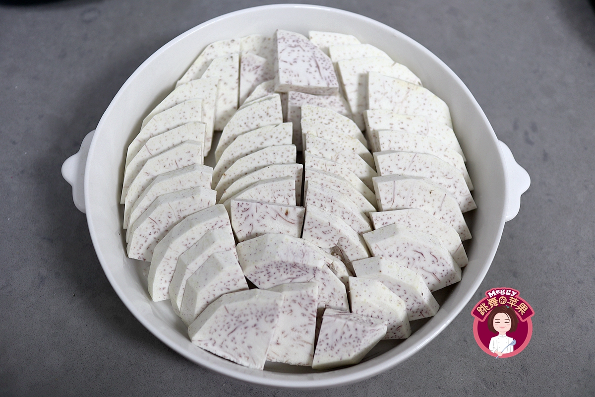 芋头削掉外皮,切厚约1公分的片;芋头片斜着摆盘,每片之间错落有致,既不占空间,还有每处都沾上酱鸭的滋味。