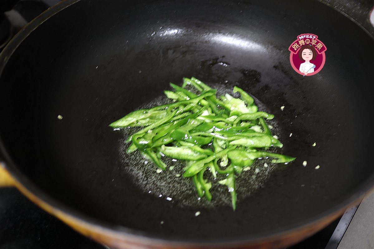 炒锅中倒少许油,先将辣椒丝煸炒出辣味,微微变色。