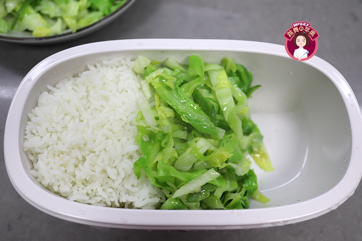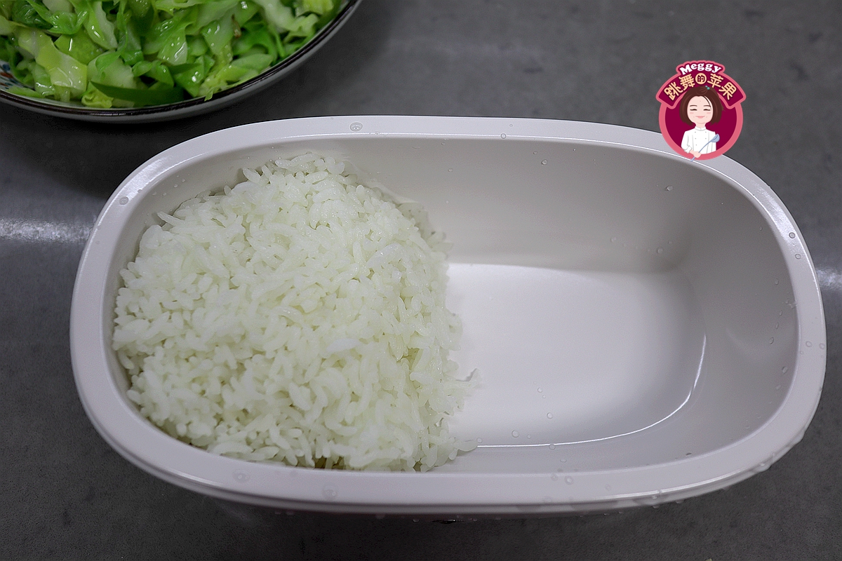 加热便当盒清洗干净,先装小半盒预约蒸好的白米饭,饭量大就按瓷实点儿,米饭放一边。