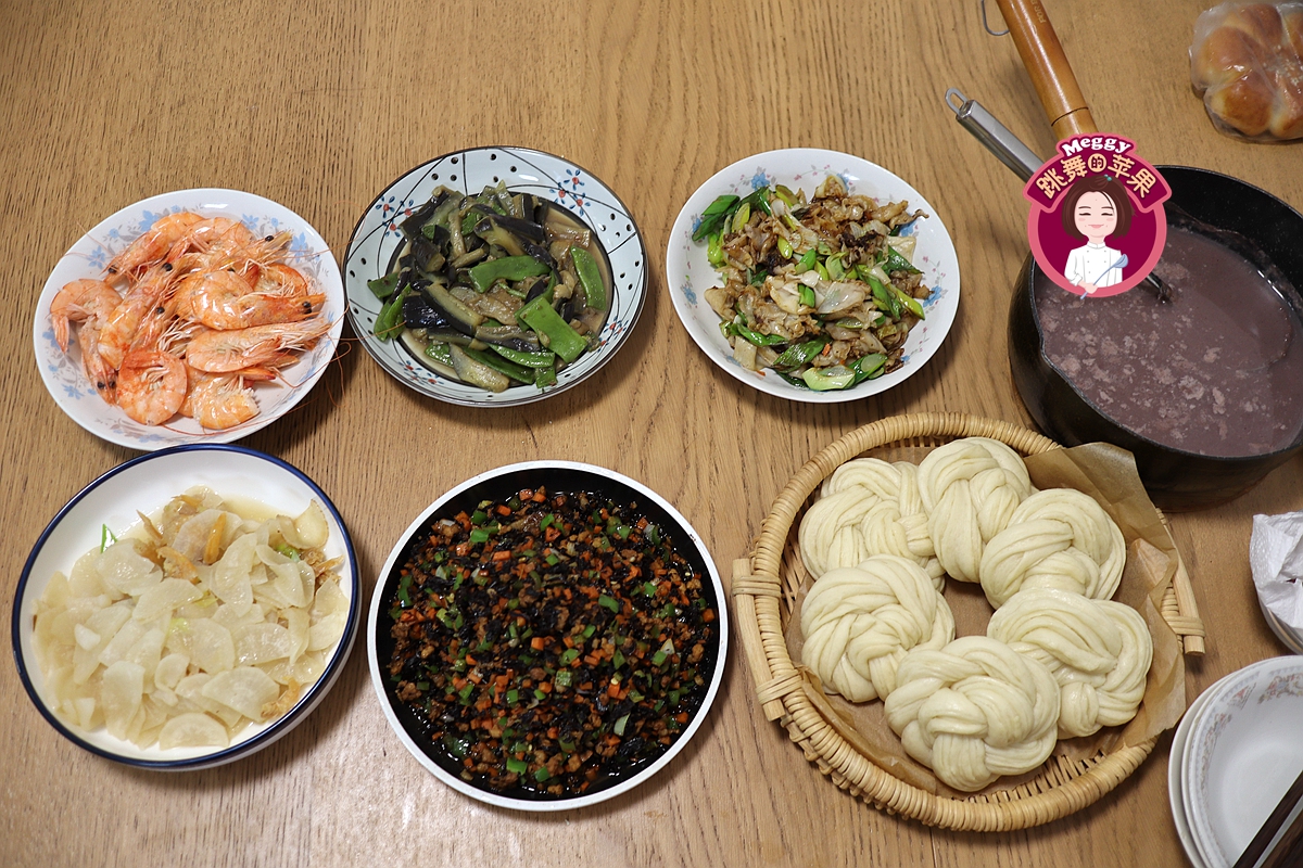 今天晚饭吃得早,四菜1稀1主食。白萝卜炖海米、白水煮虾、黑三剁、豆角素烧茄子、大葱炒面皮、早上喝剩下的紫米糊、现蒸的网红花卷。